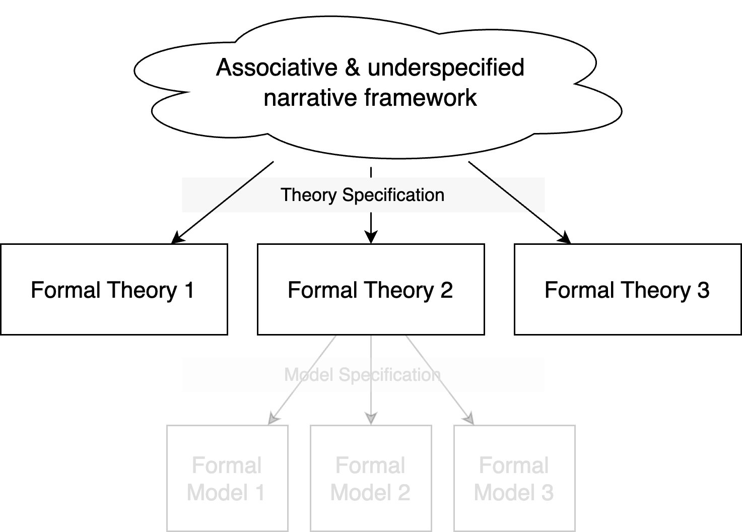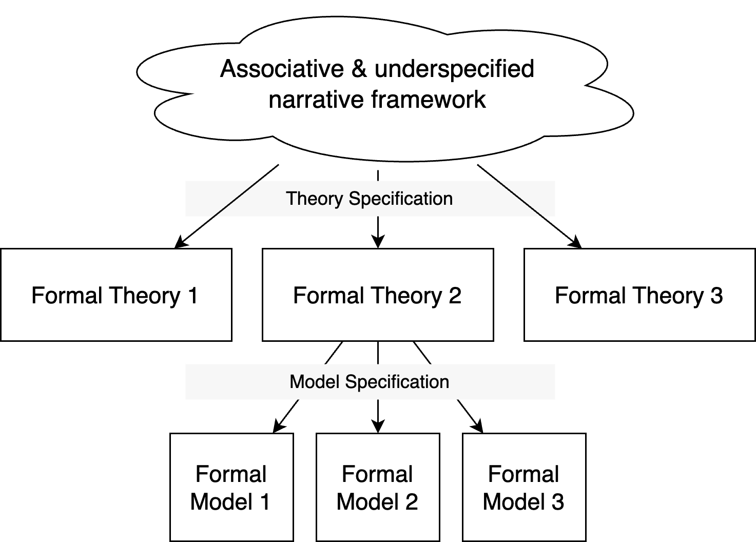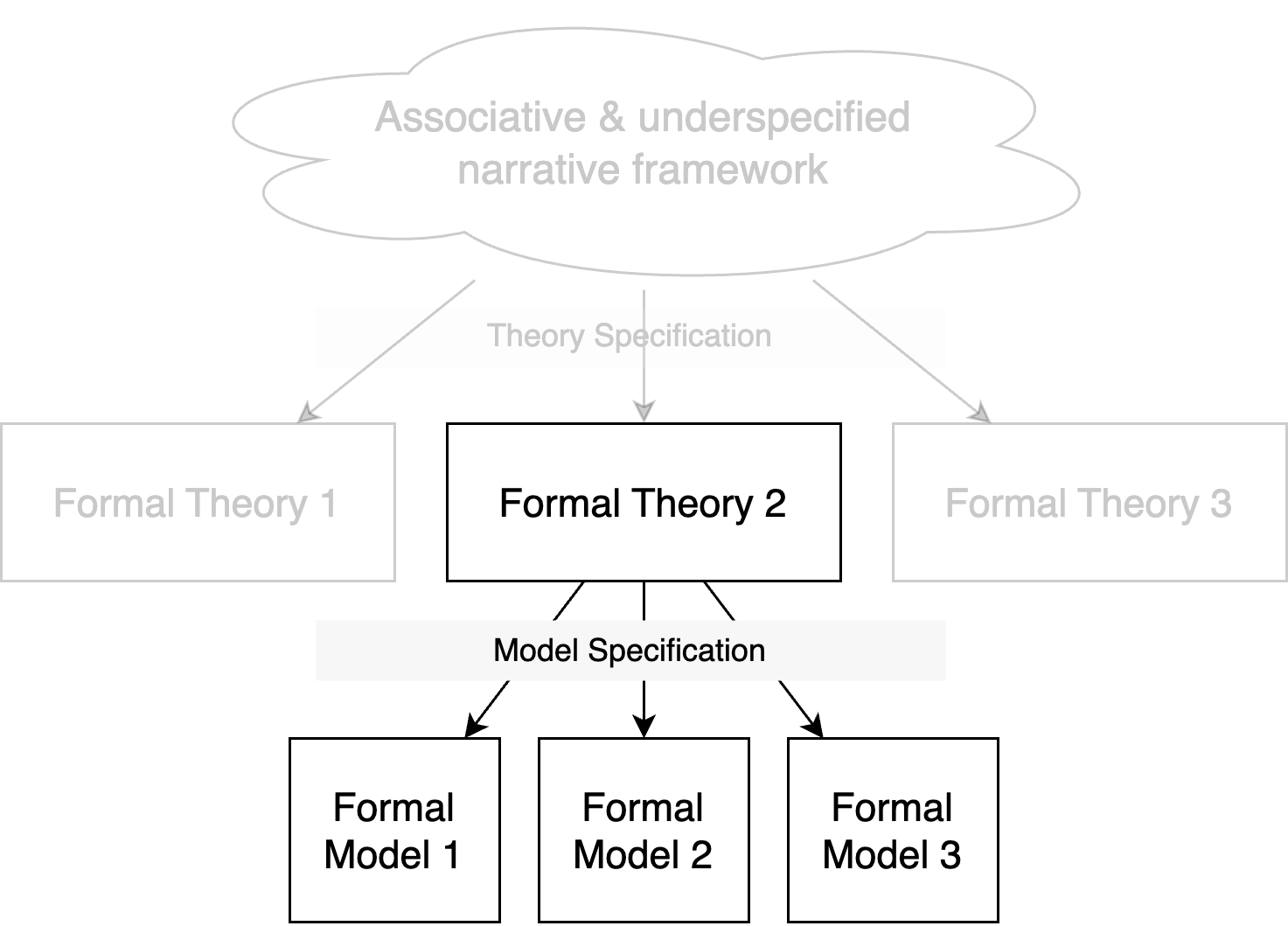 Filling the gaps between theory and implemented model is called model specification. There is no 1-to-1 mapping of a theory to a derived model: Multiple models can satisfy the axioms and constraints of a theory.