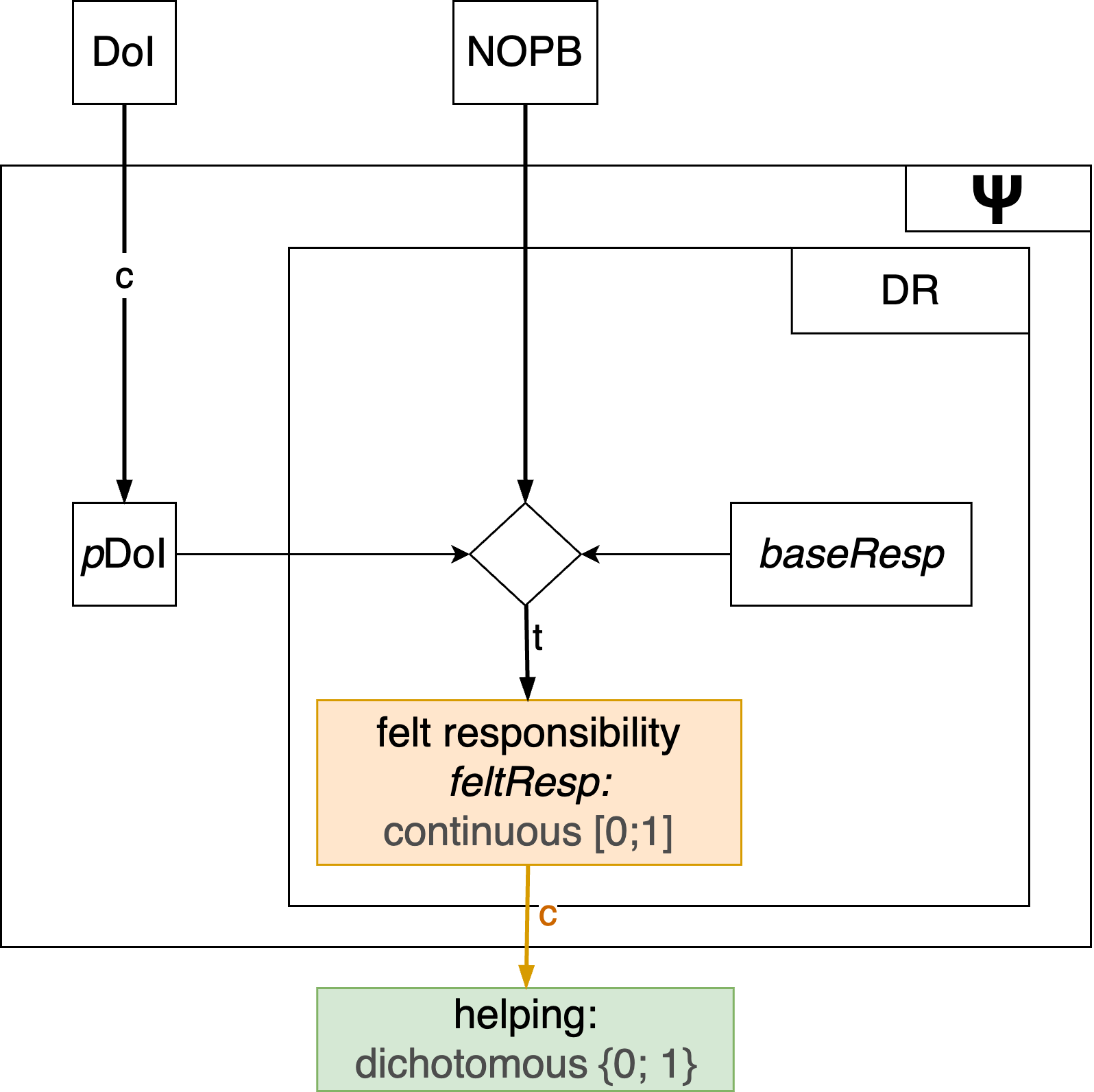 - In the bystander case, this could be a logistic regression predicting helping behavior from NOPB and DoI.