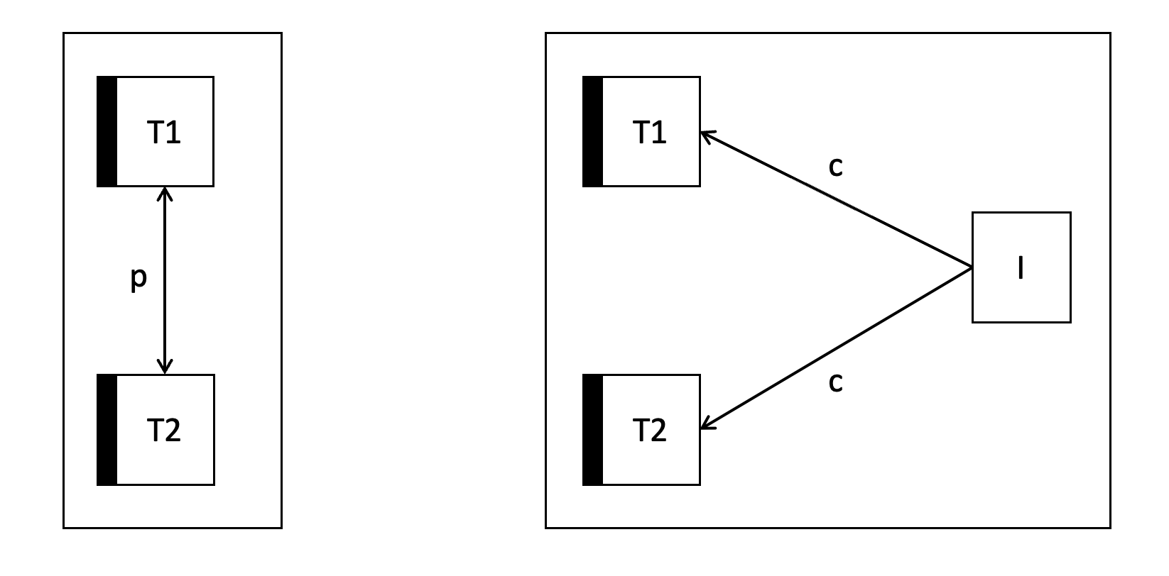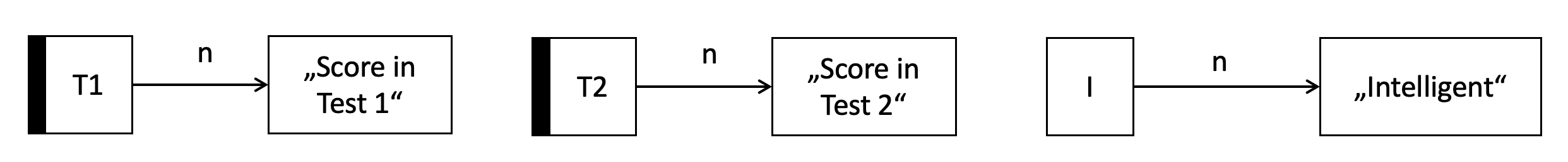 This diagram expresses the idea that a correlation between the two sets of test scores would be a reason (r) to assume that both sets of test scores reflect causal influences of some common factor (called “intelligence”).