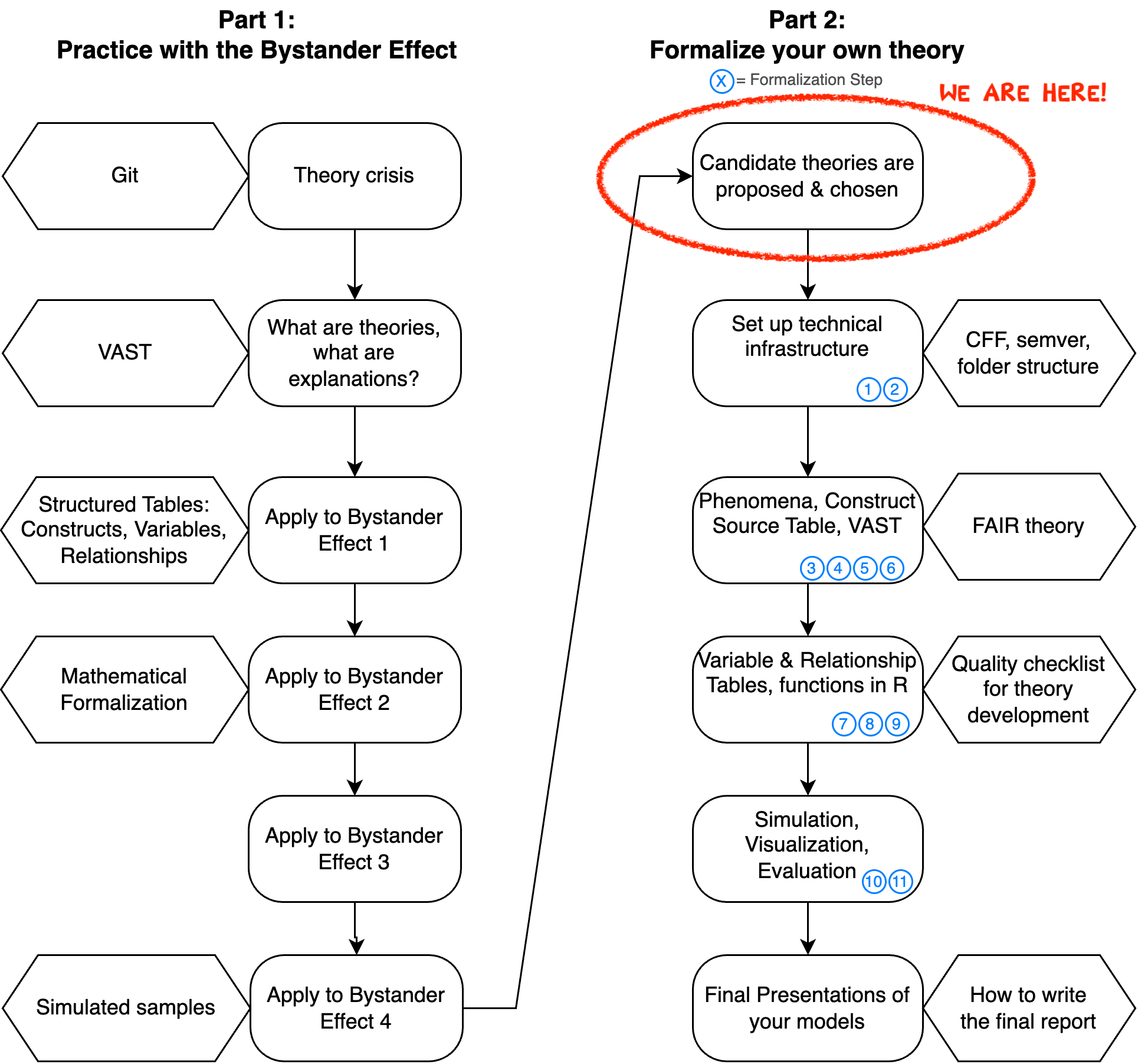 In the second part of the course, you will repeat all formalization steps that we practiced with the Bystander Effect, but this time you will work on your own formalization project. In parallel, we will learn a few more tools that improve the quality and FAIRness1 of your formalization.